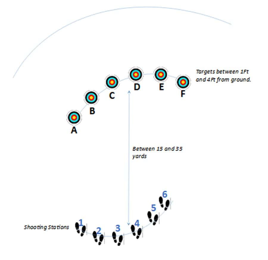 Sie besteht aus sechs Scheiben und sechs Abschussstellen, die ausgehend von einem Grundkreis von 33 Meter Durchmesser angeordnet sind. Die Entfernungen zum Ziel reichen von 30 bis 80 Yards. Geschossen werden insgesamt 36 Pfeile. Von jeder Position aus werden sechs Pfeile innerhalb von 45 Sekunden geschossen. Pro Treffer wird ein Punkt gezählt. Aber nicht nur der Zeitdruck, sondern auch die unterschiedlichen Entfernungen, welche ein sehr intuitives Bogenschießen verlangen, machen diese Trainingsart so interessant.