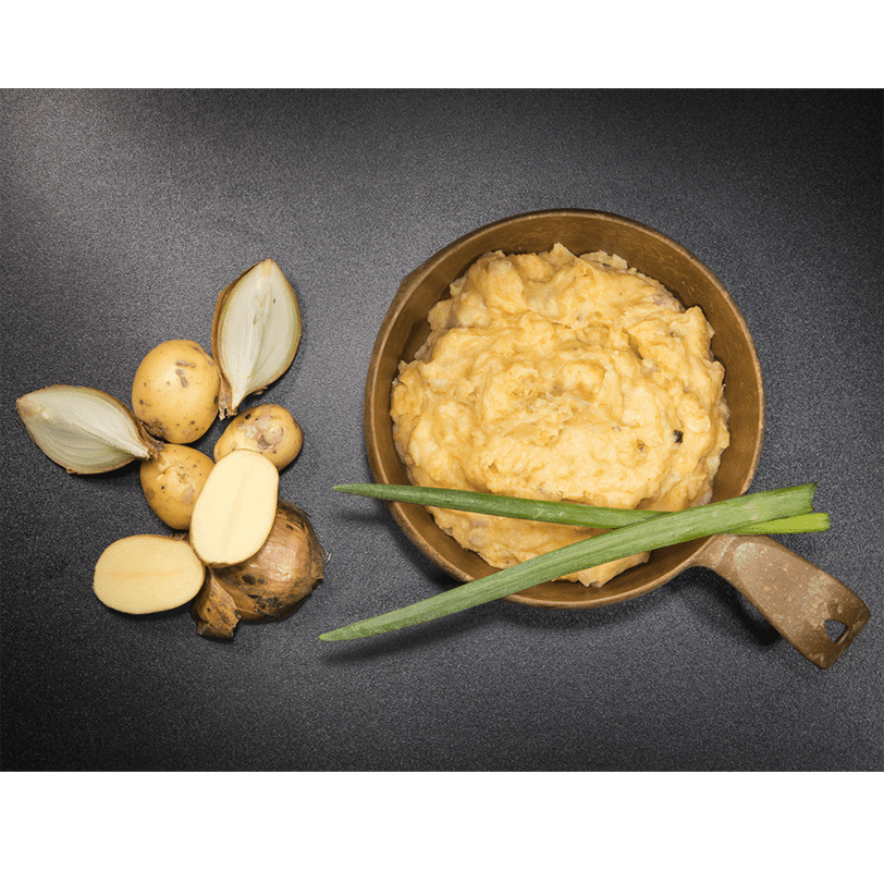 Hausgemachter Kartoffelbrei aus richtigen Kartoffeln und Milch und mit knusprigem Frühstücksspeck. Das Gericht ist mit sehr hohem Energiegehalt und hat bereits in kürzester Zeit äußerste Beliebtheit erlangt. 100% natürlich, ohne Konservierungs- und Zusatzstoffe.