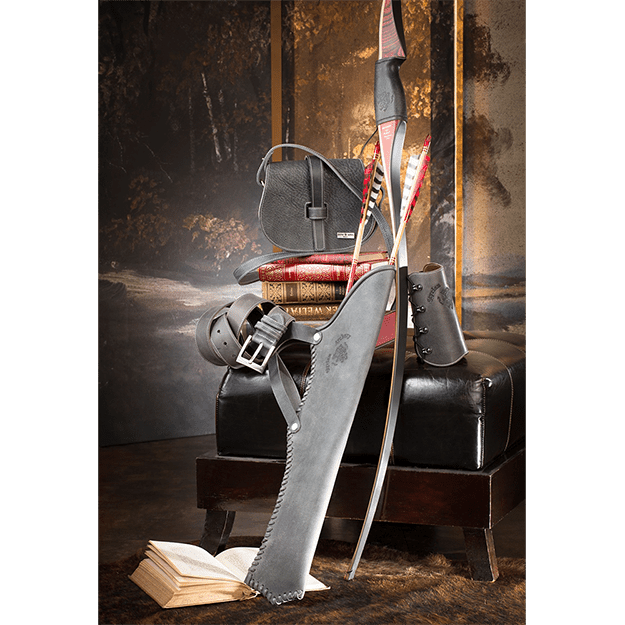 Damit spricht er nicht nur den sichereren Schützen an. Die teilweise Verwendung von Lederstreifen als Nahtmaterial und die mehrfach geschwungene Form erinnern an Ungarische Reiterbogenköcher. Sowohl damit als auch mit unserem „Black furious“ harmoniert dieser Köcher besonders gut. Die Befestigung erfolgt über eine breite Gürtelschlaufe, wodurch ein Mitschwingen des Köchers beim Gehen verhindert wird. Um den eleganten Gesamteindruck zu erhalten, ist diese Schlaufe mehrfach durchbrochen. Der Köcher kann beidseitig getragen werden.